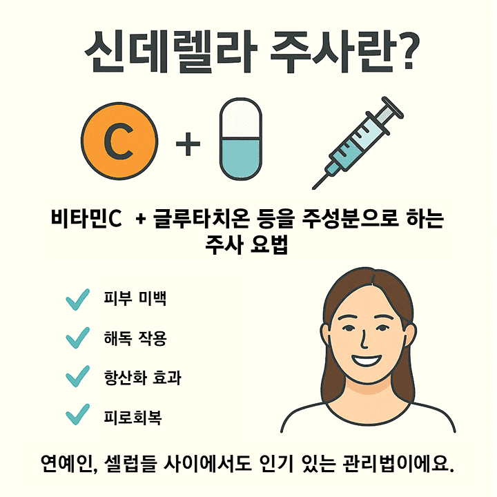 신데렐라 주사란? 비타민C + 글루타치온 등을 주성분으로 하는 주사 요법 효능: ✅ 피부 미백 ✅ 해독 작용 ✅ 항산화 효과 ✅ 피로 회복 연예인, 셀럽 사이에서도 인기 있는 관리법