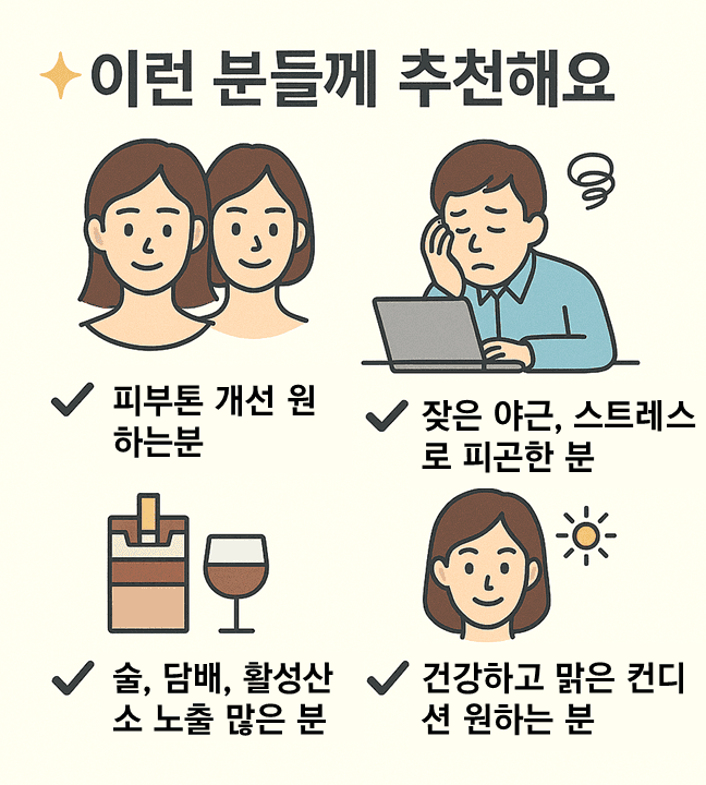이런 분들께 추천 피부톤 개선 원하는 분 잦은 야근, 스트레스로 피곤한 분 술·담배, 활성산소 노출 많은 분 건강하고 맑은 컨디션 원하는 분