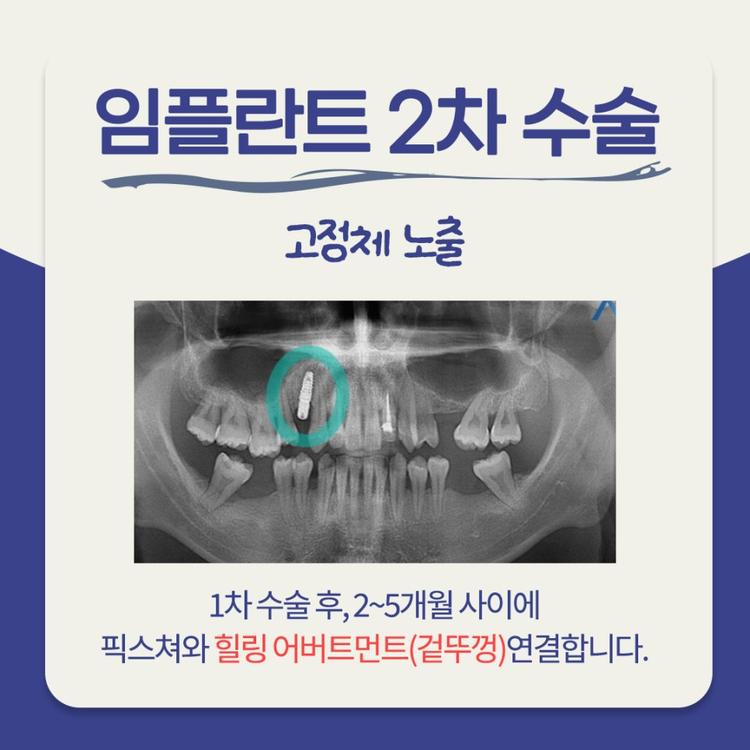 픽스처를 심은 뒤 경과를 보고 2차 수술 일정을 잡습니다. 힐링 어버트먼트라는 재료를 사용해 뿌리를 노출시키는 과정인데요. 임플란트 보철물 제작을 위해 필요한 과정이라고 보시면 됩니다.
