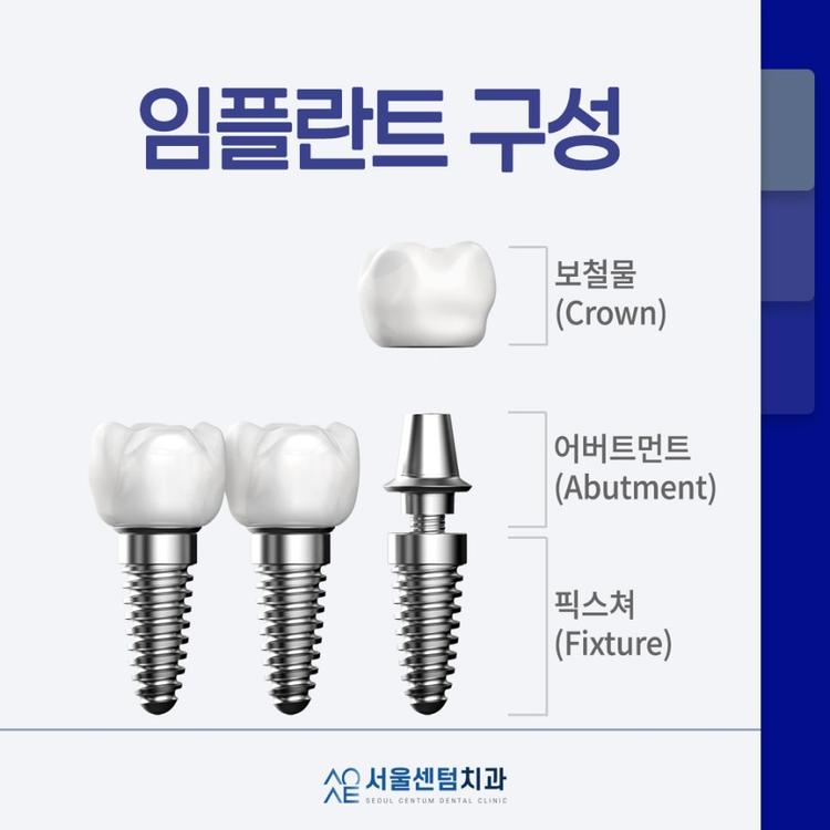 임플란트 시술과정 이라든가 내원횟수를 설명드리기전에 각 구성에 대한 이해가 먼저 필요합니다. 위 이미지를 보시면 보철물 / 어버트먼트 / 픽스쳐 이렇게 3개의 구성으로 이루어져 있죠? 픽스쳐는 치아로 치면 뿌리부분 크라운은 치아부분 어버트먼트는 그 두개를 연결하는 부분입니다.