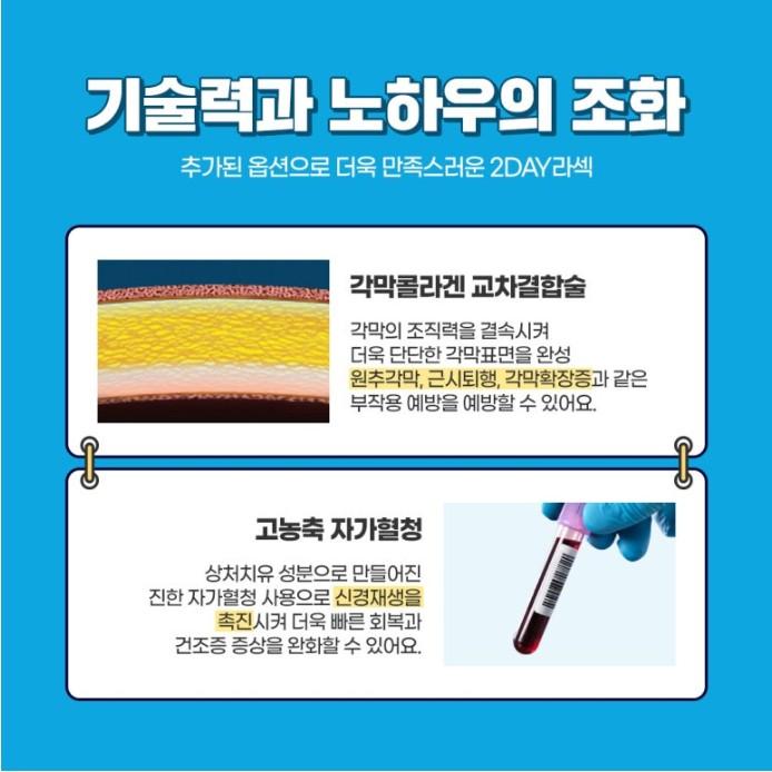 라섹 수술시 각막 상피를 벗겨내는 과정에서 소실되는 보우만막층 기능을 보완하기 위해 각막강화/양막/자가혈청안약 등의 3가지 추가 옵션을 투데이라섹에 적용하는 안과들이 많습니다. 이는 내외부 안전성 확보 및 시력퇴행 등 부작용을 최소화 하기 위한 방법입니다. 양막을 활용해 염증성 물질을 스펀지처럼 흡수시키면서, 빠른 상피 회복과 자가혈청안약 점안으로 효과적인 안구건조증 개선까지 도모하는 추가 옵션 방법들입니다.
