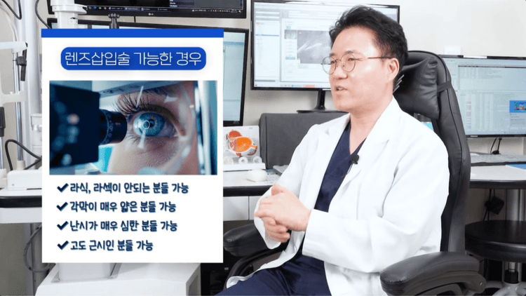 렌즈삽입술은 할 수 있는 대상이 넓은 편이지만 가격이 높아서 처음부터 이 수술을 선택하시는 분들 보다도 다른 수술이 어려워서 선택하는 경우가 많은데요. 각막이 매우 얇은 경우 고도근시 · 난시인 경우, 각막 모양이 비대칭인 경우 아벨리노 각막이영양증과 같은 유전질환이 있는 경우에 레이저 시력교정술이 어렵기 때문에 렌즈삽입술로 시력교정을 많이 하는 편입니다.