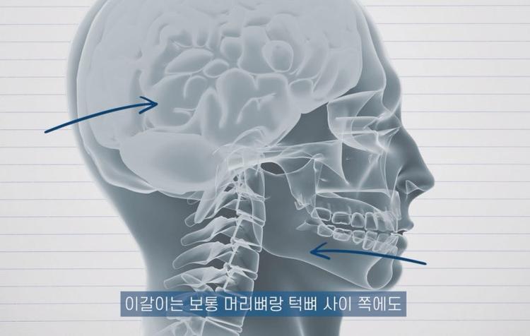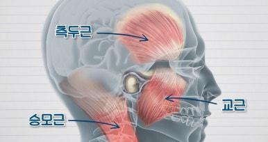 보통 머리 뼈와 텩 뼈 사이 쪽에도 무릎처럼 관절이 있는데, 관절 주변에 보통 교근, 측두근, 승모근이라고 하는 세 가지 근육이 있습니다.