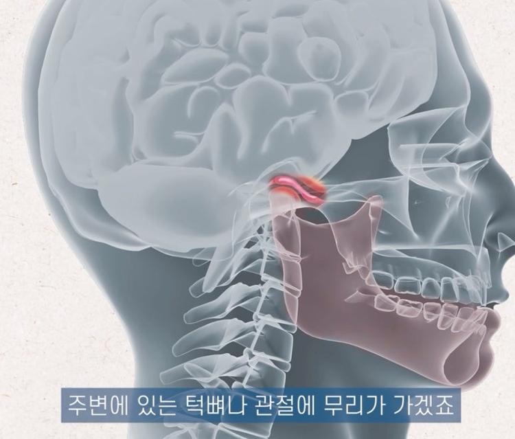 여기는 똑같이 근육에 염증이 생기면서 아팠다가 점점 근육이 커지게 되거든요. 씹는 힘도 점점 세집니다. 주변에 있던 턱 뼈나 관절에도 무리가 갈 수 있고, 치아에도 무리가 갈 수 있죠.