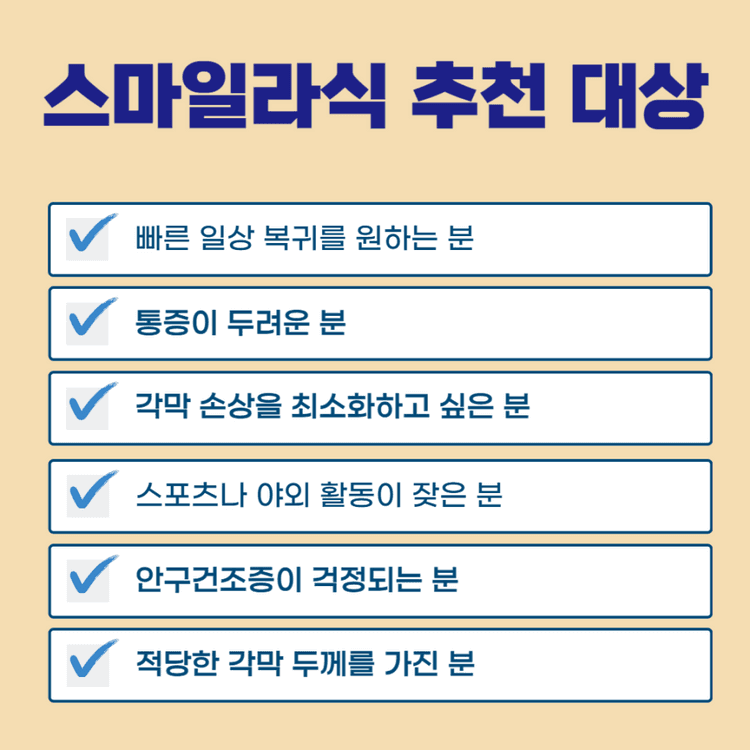 스마일라식은 다음과 같은 분들에게 적합할 수 있습니다: 통증이 걱정되거나, 빠른 회복을 원하시는 분 스포츠, 야외 활동이 잦은 분 안구건조증이 우려되는 분 각막 두께가 비교적 충분한 분 절개 범위가 작은 수술을 선호하는 분