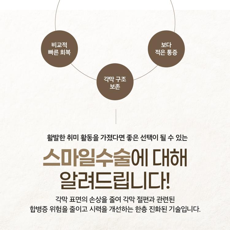 정답은 YES! 스마일수술은 고난이도 수술에 속하기 때문에 의료진의 숙련도가 굉장히 중요해요. 그래서 스마일수술 개발사에서 직접 부여하는 '스마일인증닥터' 자격은 믿고 선택할 수 있는 하나의 기준이 될 수 있답니다. 이 인증은 단순한 홍보용이 아니라, 실제로 의료진의 수술 경험, 환자 만족도, 성과 등을 종합적으로 평가해서 주는 것이기 때문에 꽤 의미 있는 지표예요. 스마일수술을 고려 중이라면 반드시 스마일인증을 받은 병원인지, 해당 의료진의 경력과 수술 사례는 어떤지 꼼꼼히 확인해보는 것이 좋아요. 상담 시 본인의 눈 상태에 맞는 수술 여부도 정확히 진단받아야 하니, 충분한 설명과 상담도 꼭 필요하답니다!