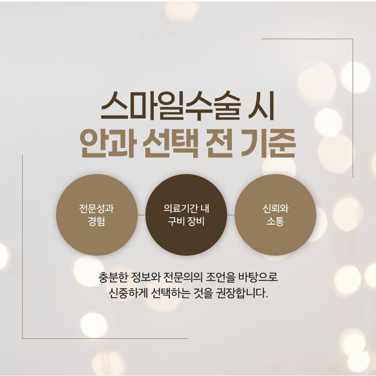 병원 선택도 정말 중요한데요, 단순히 광고를 보고 결정하기보다는 다음 세 가지를 꼭 체크해보세요. 의료진의 전문성과 경력 스마일수술은 고난이도 수술이기 때문에 숙련된 의료진을 선택하는 것이 결과에 큰 영향을 미칩니다. 수술 건수나 자격증, 실제 환자들의 후기 등도 꼼꼼히 확인해보세요. 장비와 시스템 정밀한 검사와 안정적인 수술을 위해선 최신 장비가 필요합니다. 병원에 어떤 장비가 있는지, 정기적인 점검과 유지 관리는 잘 되는지도 체크해보세요. 상담의 진정성과 소통 수술 전 상담이 얼마나 친절하고 자세한지도 중요한 기준입니다. 질문에 성실히 답해주고, 환자의 입장에서 설명해주는 병원이 더 신뢰할 수 있겠죠?