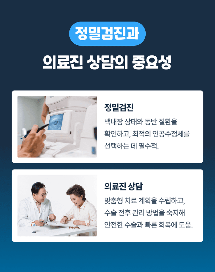 백내장 수술을 계획할 때 정밀검진과 의료진 상담은 필수적인 과정입니다.