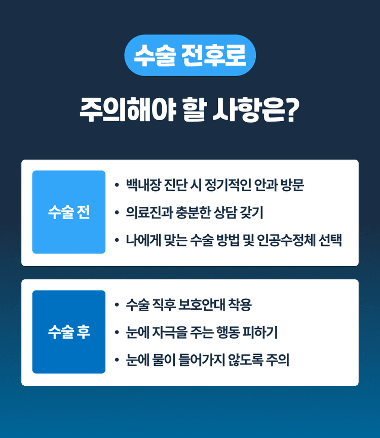 01. 백내장 수술 방법과 인공수정체 선택 02. 정밀검진과 의료진 상담의 중요성 03. 수술 전후 주의사항