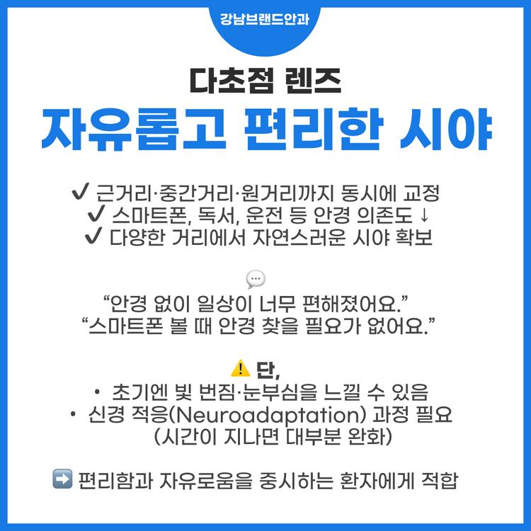 반면, 다초점 렌즈는 근거리·중간거리·원거리를 동시에 볼 수 있도록 설계되어 있어, 안경 의존도를 크게 줄여줍니다. 특히 스마트폰 사용, 독서, 운전 등 다양한 활동에서 자유로움을 느낄 수 있습니다. 그러나 일부 환자들은 야간에 빛 번짐이나 눈부심이 불편하다고 보고하기도 합니다. 또한 뇌의 적응 과정이 필요해, 적응 속도가 느린 환자는 만족도가 떨어질 수 있습니다.