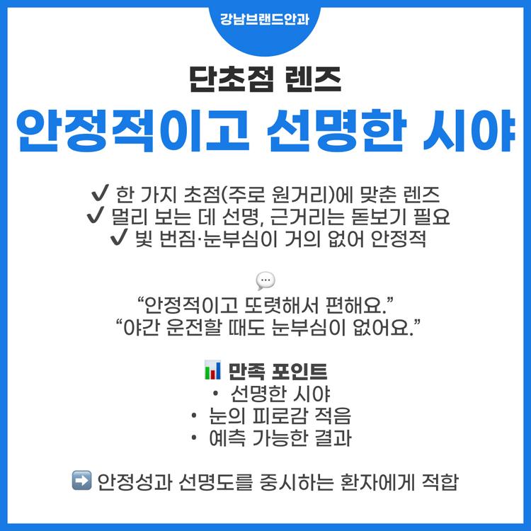 단초점 렌즈는 한 가지 초점에 맞춰져 있어 주로 원거리 시력 교정에 사용됩니다. 수술 후 멀리 보는 데는 선명하지만, 가까운 거리는 돋보기 안경이 필요할 수 있습니다. 장점은 빛 번짐이나 눈부심 같은 부작용이 거의 없고, 선명도가 높다는 것입니다. 단순하고 안정적인 시력을 원하거나 안경 착용에 불편이 없는 환자들에게 적합합니다. 실제 만족도 조사에서도 “안정적이고 편하다”는 평가가 많습니다