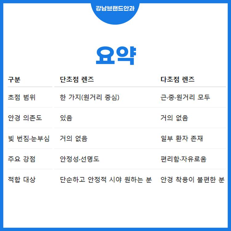 결론적으로, 단초점 렌즈는 안정성과 선명도가 장점이며, 다초점 렌즈는 편리함과 자유로움이 강점입니다. 환자 스스로 일상에서 어떤 시각적 요구가 더 중요한지 고려하고, 의료진과 충분히 상담해 선택할 때 최상의 만족도를 얻을 수 있습니다.