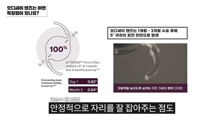 또 토릭이라고하죠. 난시를 교정하는 데 있어서 렌즈가 눈 안에 특정 각도에 맞춰 놨을 때 안정적으로 자리를 잘 잡아 주는 점도 다른 회사 렌즈 대비 우수한 장점이라고 볼 수 있겠습니다.