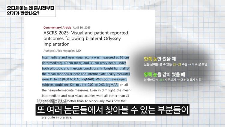 또, 미국의 여러 학회 또 논문들에서 찾아볼 수 있는 부분들이 오디세이 렌즈가 이전과는 다른 새로운 다초점 렌즈이며 기존에 다른 렌즈들에 비해서 월등한 더 좋은 결과를 낸다는 그런 여러 결과들을 보면서 환자분들께서 많은 기대를 하고 있고 또 저 역시나 의사 입장에서도 큰 기대를 걸고 있는 렌즈입니다.