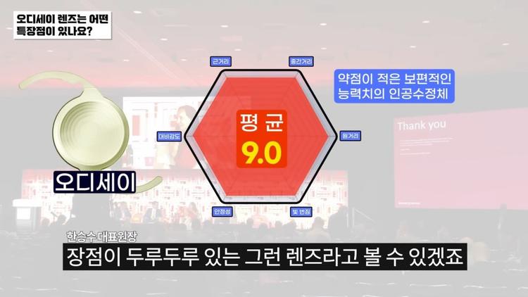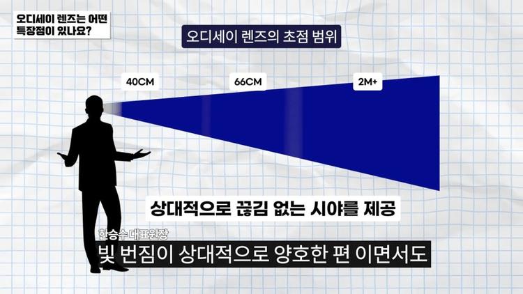 그래도 각각의 렌즈의 장단점을 따져 봤을 때 오디세이 렌즈는 기존의 단점들을 분명 많이 보완했기 때문에 환자분들께서 치명적으로 불편해하고 느끼는 대표적인 빛번짐, 선명도 이런 부분들을 상당히 많이 개선하면서도 기존 렌즈의 장점인 회절 구조를 갖고 있기 때문에 두루두루 보인다는 장점이 이제 환자분들께 느껴지는 고유의 장점이겠죠.