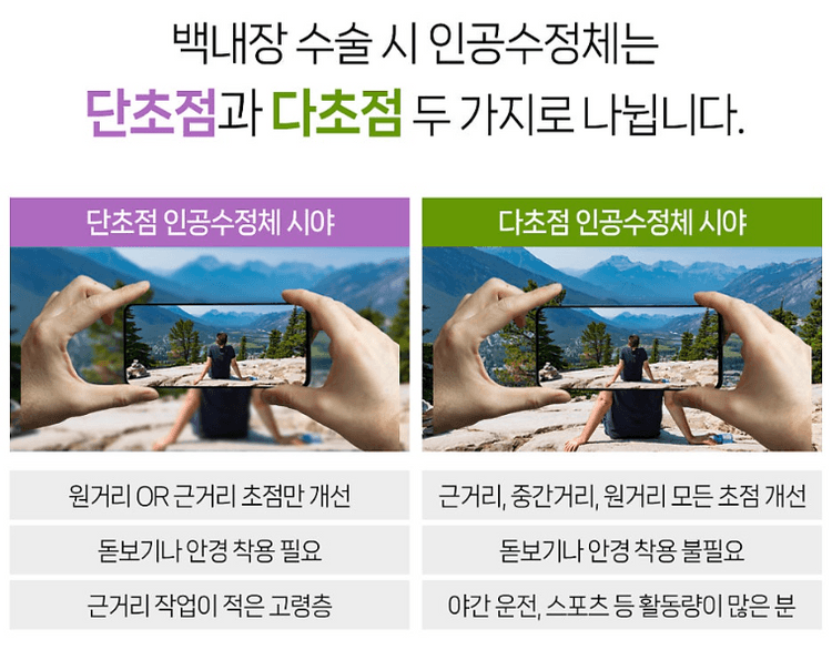 노안만 있는 경우에는 돋보기 착용이나 레이저 교정으로 시야를 보완할 수 있습니다. 하지만 백내장이 동반된 경우에는 혼탁해진 수정체를 제거하고 인공수정체를 삽입하는 수술이 필요합니다. 인공수정체는 크게 단초점 렌즈: 원거리 또는 근거리 중 한 곳에 초점을 맞추는 방식 다초점 렌즈: 원·중·근거리를 모두 볼 수 있도록 설계되어 안경 착용 빈도를 줄여주는 방식 으로 나뉩니다. 최근에는 다양한 시야 거리에서 편안함을 주는 다초점 렌즈의 선택이 늘고 있습니다. 직업, 생활습관, 시력 요구도에 따라 적합한 렌즈를 선택하는 것이 중요합니다.