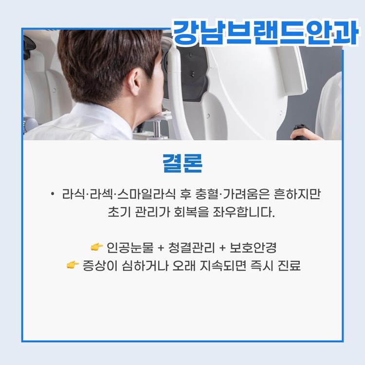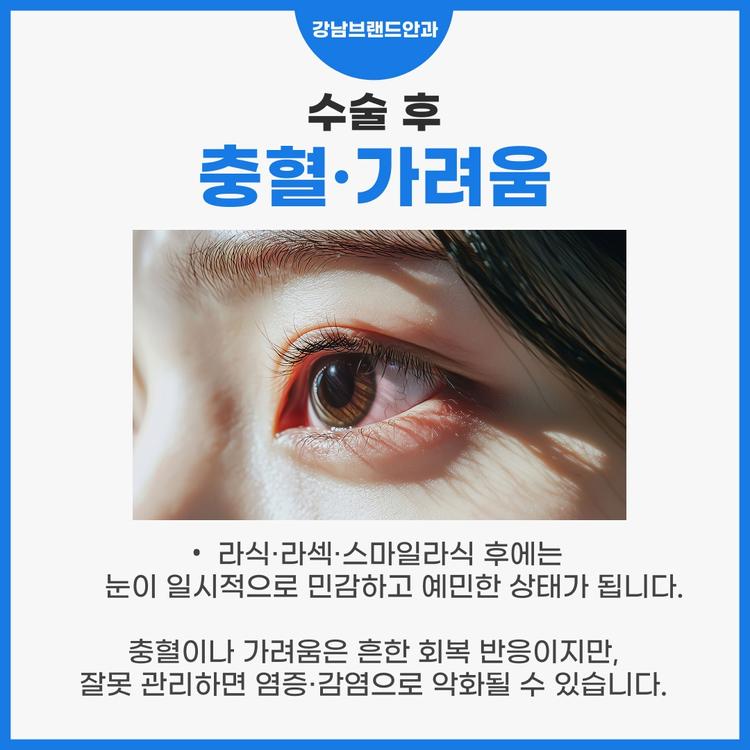안녕하세요. 기대되는 내일을 만드는 강남브랜드안과입니다. 라식·라섹·스마일라식 수술 후에는 눈이 민감해져 충혈이나 가려움증 같은 불편이 나타날 수 있습니다.