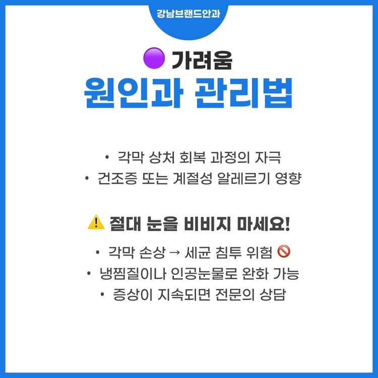 둘째, 가려움증의 원인과 관리입니다. 수술 직후 상처 회복 과정에서 발생하는 자극, 건조증, 또는 계절성 알레르기 등이 원인이 될 수 있습니다. 가려움이 있다고 눈을 비비면 각막에 손상이 생기고 세균이 침투할 위험이 커집니다. 따라서 절대 눈을 비비지 말고, 증상이 심하면 냉찜질이나 인공눈물을 활용해 완화하는 것이 좋습니다.