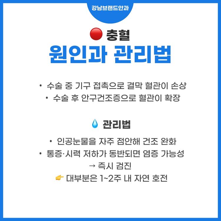 첫째, 충혈의 원인과 관리입니다. 충혈은 수술 중 사용된 기구로 인해 결막 혈관이 손상되거나, 수술 후 안구건조증이 심해져 발생하는 경우가 많습니다. 이런 경우 대부분 일시적이며, 인공눈물을 자주 사용하면 증상이 완화됩니다. 그러나 충혈이 며칠 이상 지속되거나 통증·시력 저하가 동반된다면 단순 회복이 아닌 염증일 수 있으므로 반드시 검진을 받아야 합니다.