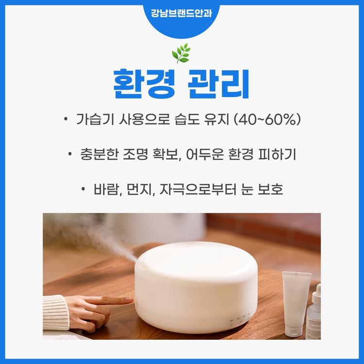 장시간 업무나 학업으로 전자기기 사용이 불가피한 경우, 가습기를 사용해 실내 습도를 유지하고, 책상 조명을 적절히 확보하는 것도 도움이 됩니다. 건조한 환경과 어두운 조명은 눈 피로를 가중시키기 때문입니다.