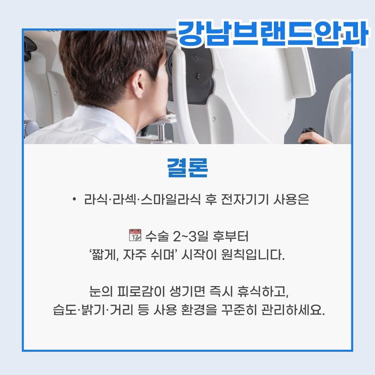 안녕하세요. 기대되는 내일을 만드는 강남브랜드안과입니다. 라식·라섹·스마일라식 수술 후 환자분들이 가장 많이 묻는 질문 중 하나는 “언제부터 컴퓨터나 스마트폰을 사용해도 될까요?”입니다.