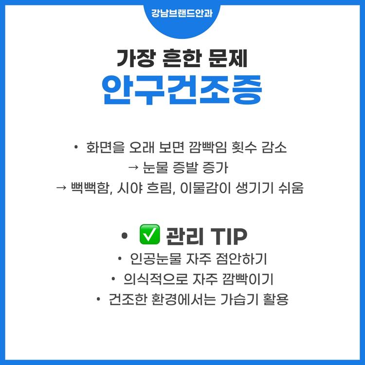 컴퓨터와 스마트폰을 사용할 때 가장 흔한 문제가 바로 안구건조증입니다. 화면을 오래 보면 눈 깜빡임 횟수가 줄어 눈물이 금세 마르고, 이로 인해 뻑뻑함·이물감·시야 흐림 같은 증상이 생깁니다. 따라서 전자기기 사용 시에는 의식적으로 자주 깜빡이고, 필요할 경우 인공눈물을 점안해 눈 표면을 촉촉하게 유지해야 합니다.