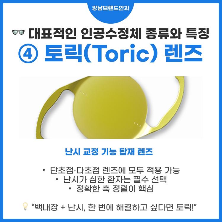 난시를 교정할 수 있는 기능이 추가된 렌즈로, 단초점·다초점 모두에서 적용 가능합니다. 난시가 심한 환자에게는 필수적인 선택지입니다.