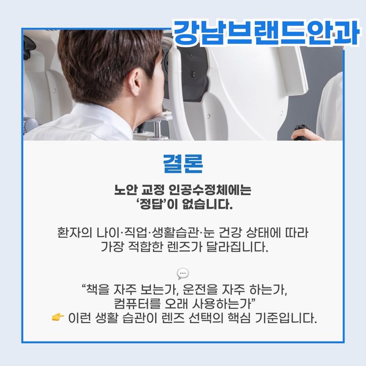 노안 교정 인공수정체는 환자의 연령, 직업, 생활 습관, 동반 질환에 따라 선택이 달라져야 합니다. 예를 들어 책을 자주 읽는 환자는 근거리 강화형 다초점 렌즈가, 운전과 컴퓨터 사용이 많은 환자는 EDOF 렌즈가 더 적합할 수 있습니다.