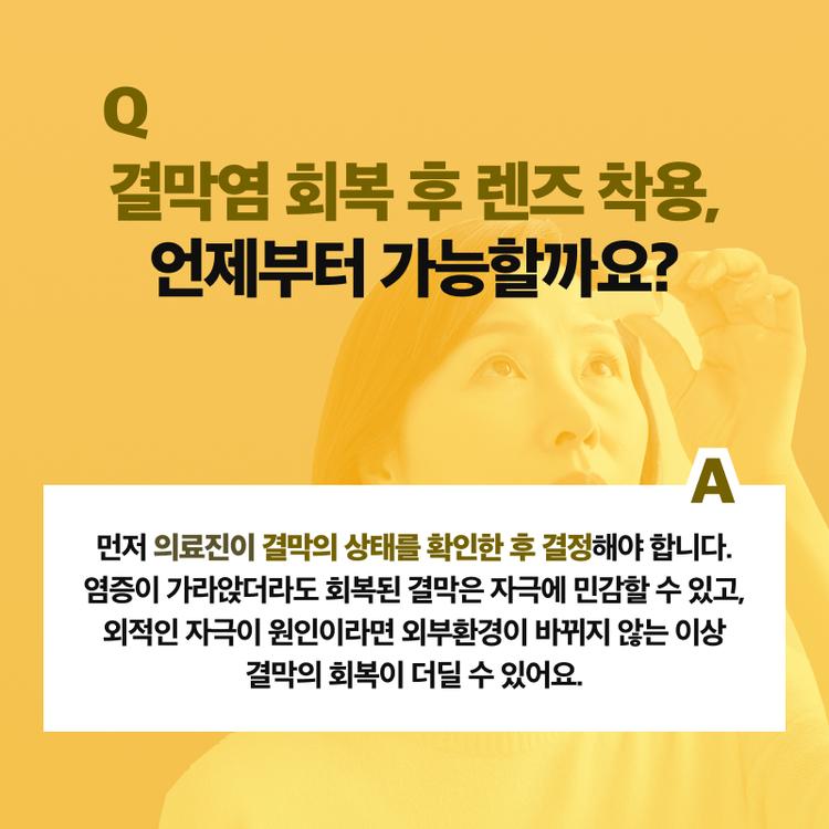 1️⃣렌즈 착용에 익숙하신 분들은 결막염이 반복되면 “지금 쓰고 있는 렌즈가 문제인가?” 혹은 “완전히 낫지 않은 건 아닐까?” 하는 고민이 많으신데요. 결막염이 회복된 후라고 해도 렌즈를 다시 착용해도 되는지는 결막의 상태를 직접 보고 판단해야 합니다. 겉보기에 충혈이나 눈곱이 사라졌다고 해도, 회복 중인 결막은 아직 자극에 예민할 수 있기 때문에 무리하게 렌즈를 착용하면 다시 염증이 생길 수 있어요. 또 한 가지 중요한 것은 결막염을 앓던 당시 착용하던 렌즈는 절대 다시 사용하시면 안 된다는 점입니다. 렌즈 표면에 남아 있을 수 있는 세균이나 분비물 등이 또 다른 염증의 원인이 될 수 있기 때문이에요. 렌즈뿐만 아니라 렌즈 보관 용기 역시 교체하는 게 좋습니다. 2️⃣결막염 회복 후 렌즈를 다시 사용하시려면 반드시 안과 진료를 통해 눈 상태를 확인 받고 필요한 경우엔 약물 치료를 조금 더 이어가면서 시기를 조절하는 것이 안전합니다. 조급해하지 마시고 눈이 완전히 회복될 시간을 주세요. 결막염 이후엔 렌즈 관리도 전보다 더 철저하게 관리해주시는 것이 좋은데요. 결막염 치료 후 렌즈 착용을 재개하실 땐 기존보다 더 꼼꼼한 위생 관리가 필요합니다. 손 씻기는 기본이며, 렌즈 세척과 보관도 매일 신경 써야 합니다. 가능하다면 하루 착용하고 버리는 일회용 렌즈(원데이 렌즈)를 사용하는 것도 좋은 방법입니다. 그리고 장시간 착용이나 먼지 많은 환경에서의 사용은 피해주세요. 눈이 아직 완전히 회복되지 않은 상태에서는 조금만 자극이 있어도 다시 불편해질 수 있기 때문이에요. 무엇보다 이상 증상이 다시 생기면 무리하지 말고 바로 안과에 내원해주시길 권장 드립니다.