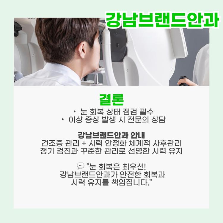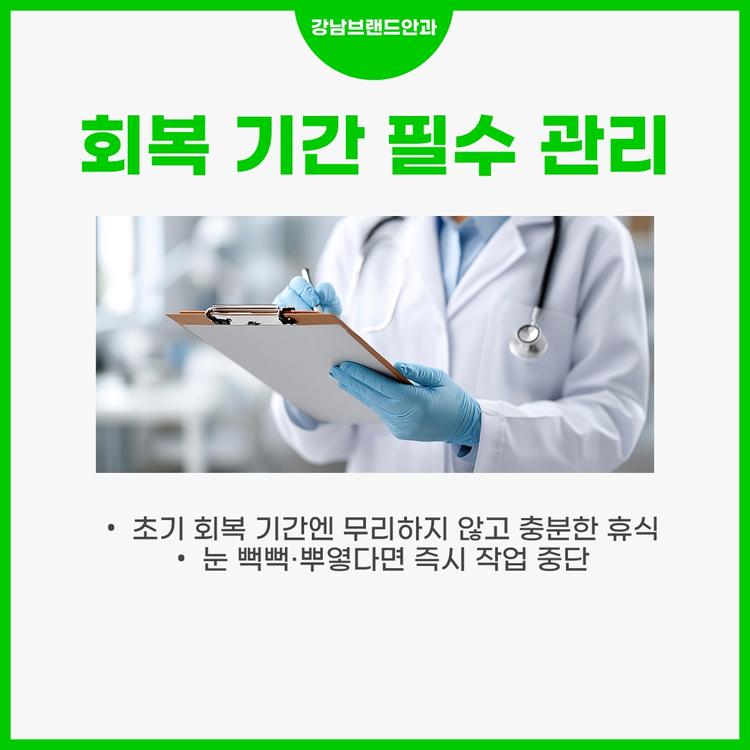 스마일라식 후 초기 회복 기간에는 눈에 피로가 쌓이지 않도록 충분한 휴식을 취해야 합니다. 눈이 뻑뻑하거나 뿌옇게 느껴질 때는 즉시 작업을 멈추고 눈을 쉬게 하는 것이 좋습니다. 정기 검진을 통해 눈의 회복 상태를 점검하고, 이상 증상이 있으면 반드시 안과 전문의와 상의하세요.