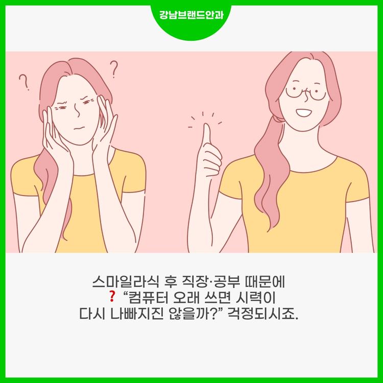 스마일라식 후 직장이나 공부 때문에 컴퓨터를 오래 써야 하는 분들이 많습니다. “이러다 시력이 다시 나빠지는 건 아닐까?” 걱정되시죠?