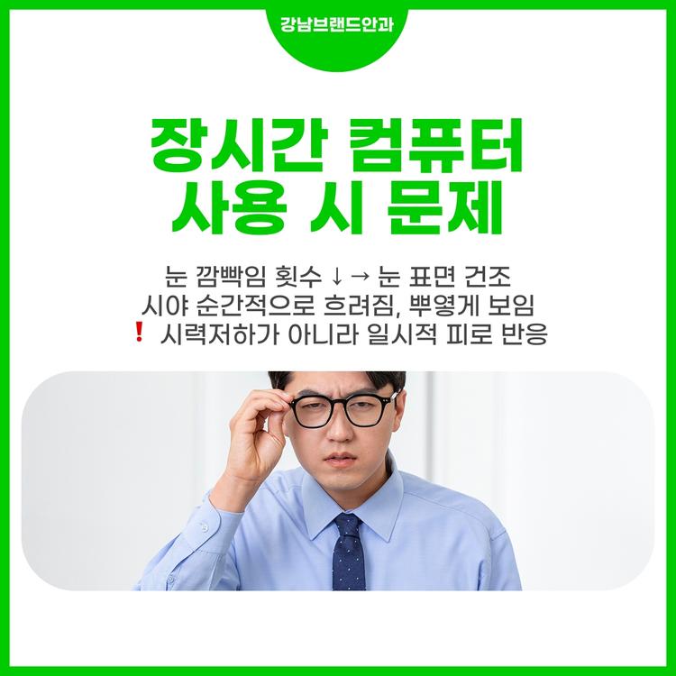 컴퓨터를 오랫동안 보면 눈 깜빡임 횟수가 줄어들면서 눈 표면이 건조해지고, 이로 인해 시야가 순간적으로 흐려지거나 뿌옇게 보이는 증상이 나타날 수 있습니다. 이런 증상은 시력저하가 아니라 일시적인 피로 반응으로, 적절한 관리로 충분히 개선할 수 있습니다.