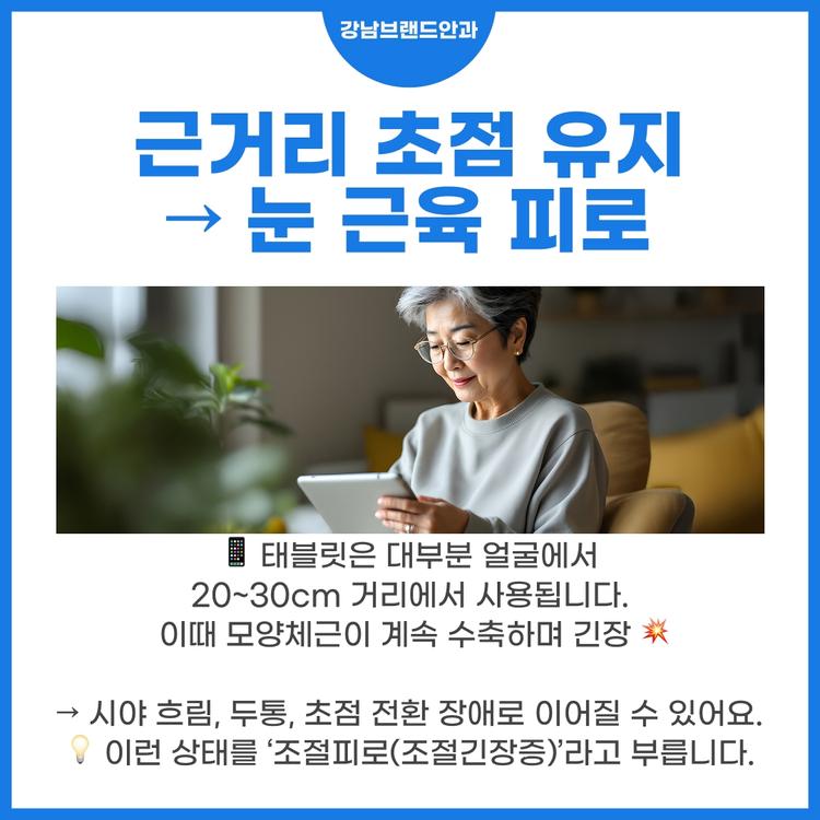 아이패드나 태블릿은 대부분 얼굴에서 20~30cm 거리에서 사용됩니다. 이때 눈 안의 모양체근이 가까운 물체에 초점을 맞추기 위해 계속 수축하는데요, 이 근육이 오랫동안 긴장하면 눈 피로, 시야 흐림, 두통으로 이어집니다. 📍 이 상태를 ‘조절피로(조절긴장증)’라고 하며, 심해지면 일시적인 시력 저하나 초점 전환 장애를 일으킬 수 있습니다. ➡ 장시간 태블릿 사용 후 “눈이 무겁다”, “멀리 볼 때 초점이 늦게 잡힌다”면 이미 눈의 피로가 누적된 상태입니다.
