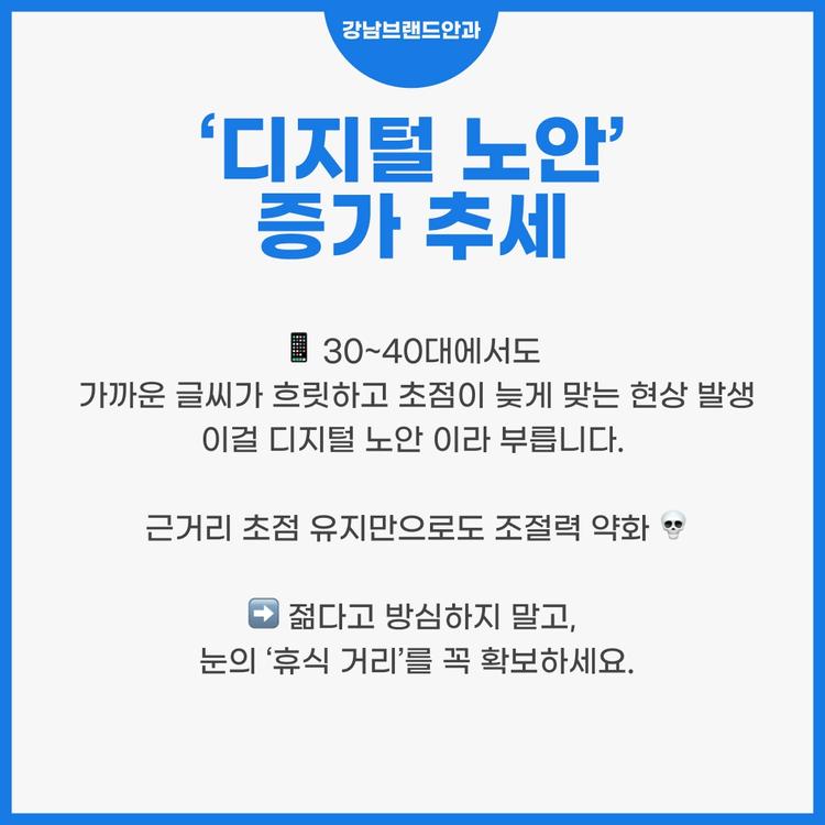 최근 30~40대에서도 ‘노안처럼 보이는 증상’이 늘고 있습니다. 스마트폰, 태블릿 등 근거리 초점을 지속적으로 유지하면서 눈의 조절력이 일시적으로 떨어지는 현상인데요, 이를 디지털 노안(Digital Presbyopia) 이라고 부릅니다. 📍 아직 젊다고 안심할 수 없습니다. 장시간 태블릿 사용은 눈의 조절 기능을 약화시켜 노안이 더 일찍 찾아올 수 있습니다.