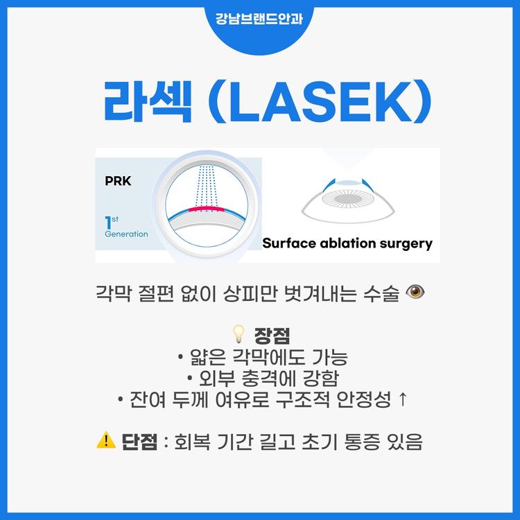 ① 라섹 (LASEK) 라섹은 각막 절편(뚜껑)을 만들지 않고 각막 상피층만 벗겨낸 뒤 레이저를 조사하는 방식입니다. • 절삭 깊이가 얕아 얇은 각막에도 적용 가능 • 외부 충격에 강함 • 수술 후 각막 잔여량이 많아 구조적으로 안정적 ⚠️ 단점은 회복 기간이 길고 초기 통증이 있을 수 있지만, 시력의 질과 안정성 면에서는 매우 우수합니다.