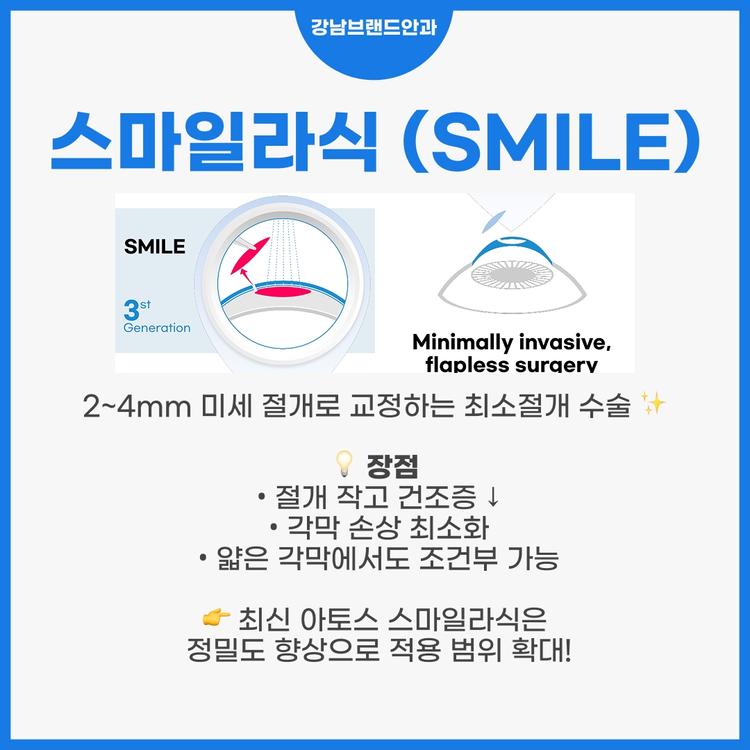 ② 스마일라식 (SMILE) 스마일라식은 각막 절편을 만들지 않고 2~4mm의 미세 절개로 각막 실질을 분리해 제거하는 수술입니다. • 절개가 작고 각막 손상이 적음 • 건조증 및 각막 변형 위험 ↓ • 얇은 각막에서도 조건부 가능 (남는 두께 충분 시) 💡 특히 최신 장비인 아토스 스마트라식은 레이저 정밀도가 향상되어 각막 손상을 최소화합니다.