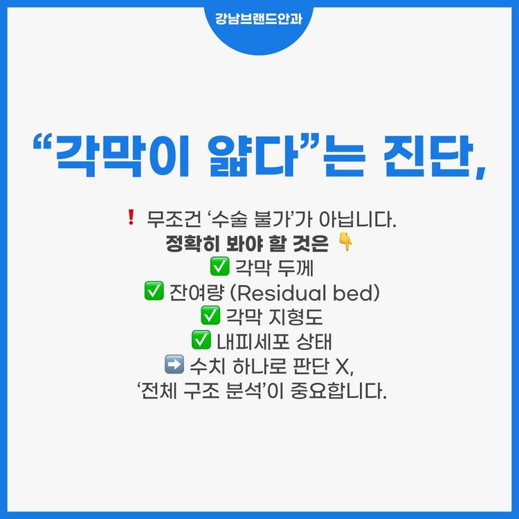 검사에서 “각막이 얇다”는 말은 무조건 수술 불가능을 의미하지 않습니다. ❗ 정확히 확인해야 할 것은 • 각막 두께 • 잔여량(Residual bed) • 각막 지형도(굴곡 형태) • 각막 내피세포 상태 즉, 단순히 수치 하나로 판단하기보다 전체적인 눈 구조와 안전 여유분을 함께 분석해야 합니다.