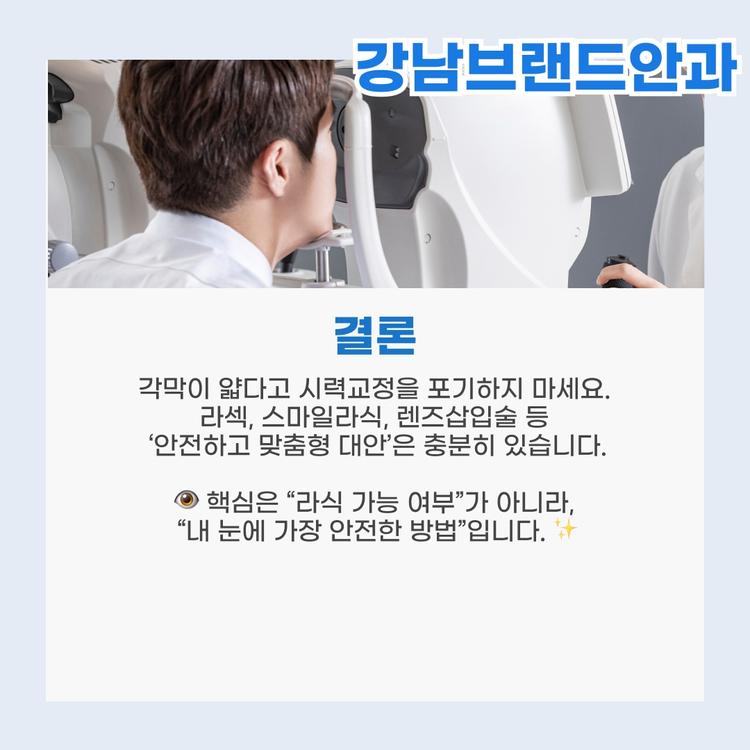 시력교정술을 포기할 필요는 없습니다. 중요한 것은 “라식이냐, 아니냐”가 아니라 “내 눈에 가장 안전한 방법이 무엇이냐” 입니다. 라섹, 스마일라식, 렌즈삽입술 등은 각막이 얇은 분들에게도 충분히 안정적이고 효과적인 선택이 될 수 있습니다. 👁️ 정밀검사를 통해 눈 상태를 정확히 파악한 뒤, 전문의와 함께 가장 안전한 수술법을 결정하는 것, 그것이 시력교정 성공의 핵심입니다.