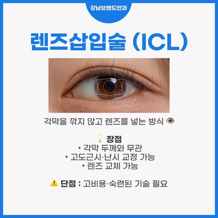 렌즈삽입술은 각막을 깎지 않고 홍채와 수정체 사이에 렌즈를 넣는 시력교정술입니다. • 각막 두께와 상관없이 교정 가능 • 고도근시, 얇은 각막 모두 적합 • 수술 후 렌즈 교체 가능 (reversible surgery) ⚠️ 단, 수술 난이도가 높고 비용이 비급여로 다소 높은 편입니다.