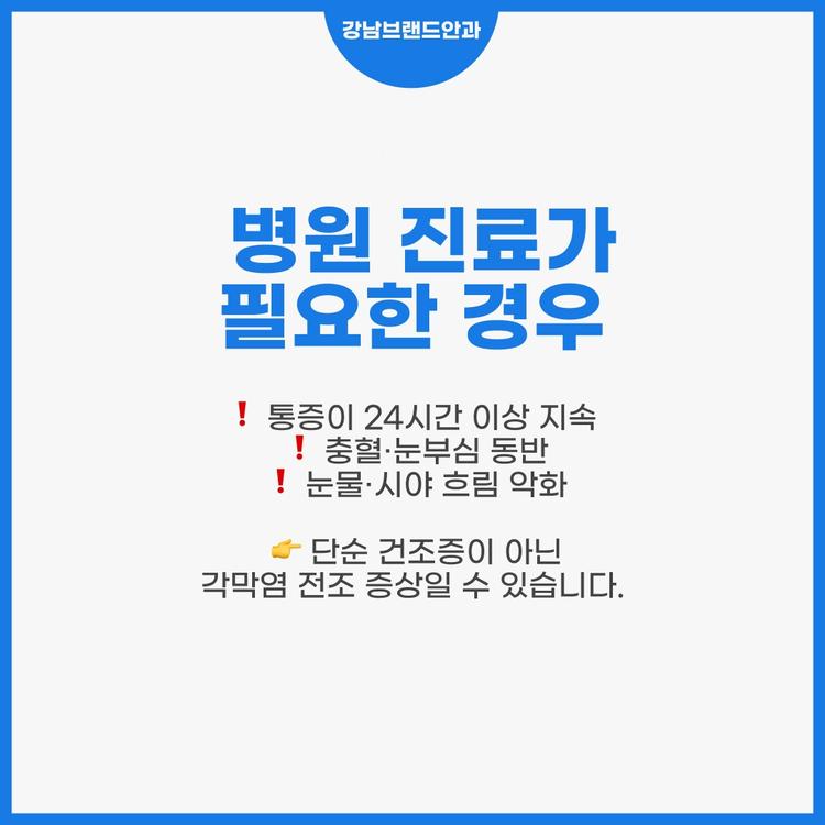 오염/손상 렌즈 표면 흠집, 먼지 이물감, 따가움 즉시 제거 후 교체 건조증 장시간 착용, 난방·에어컨 뻑뻑함, 시야 흐림 인공눈물, 착용시간 단축 염증 세균·곰팡이 감염 통증·눈물·충혈 안과 진료·항생제 치료 알레르기 단백질 침착 가려움·충혈 렌즈 세척·일회용 사용 👉 증상이 심하거나 24시간 이상 지속되면 반드시 콘택트렌즈 통증 대처법 중 ‘안과 진료’를 선택해야 합니다.