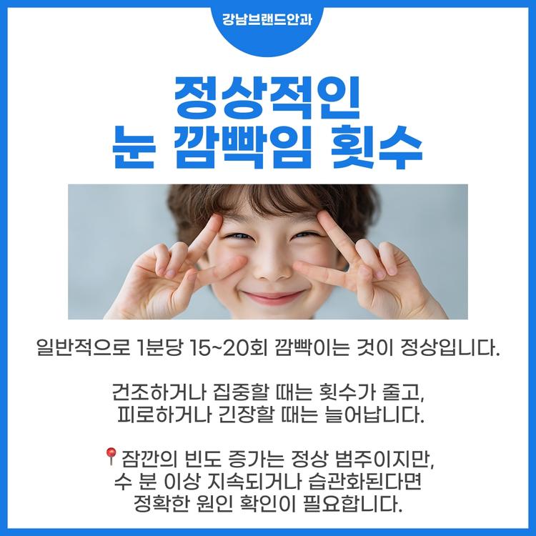 • 일반적인 눈 깜빡임은 1분당 15~20회 정도입니다. • 건조하거나 집중할 때는 줄고, 피로하거나 긴장할 때는 늘어납니다. 📍즉, 잠깐의 빈도 증가는 정상 범주이지만 수 분 이상 지속되거나 습관화된다면 눈 깜빡임 원인을 점검해야 합니다.