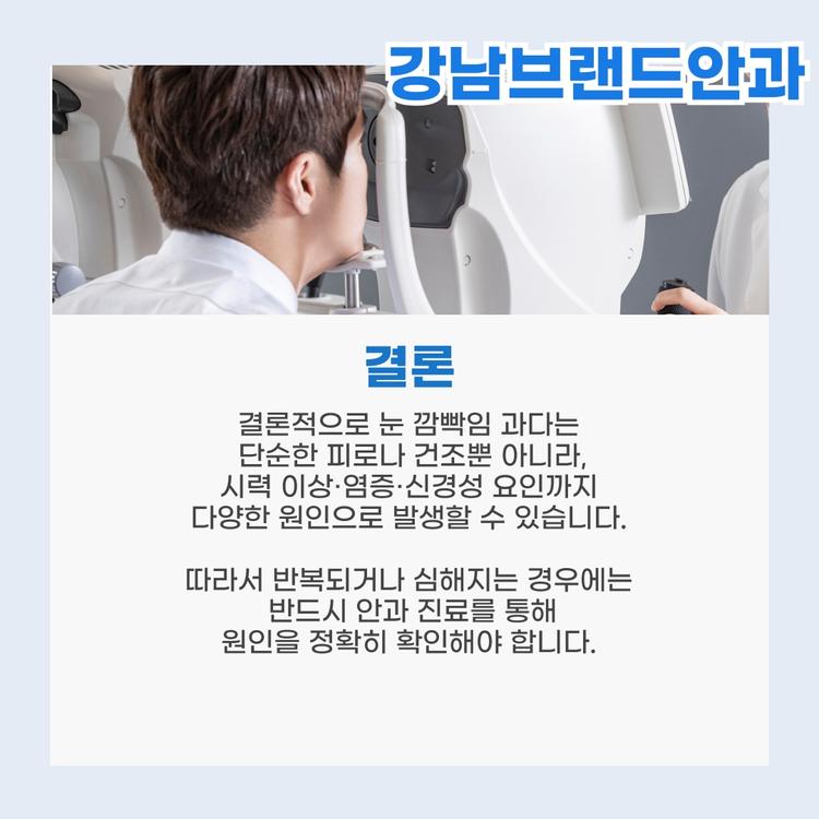 결론적으로 눈 깜빡임 원인은 피로·건조에서 시작해 신경성 요인까지 다양합니다. 단순한 습관으로 치부하지 말고, 반복되거나 심해지는 경우에는 안과 진료를 통해 정확한 원인을 확인해야 합니다. 즉, 눈 깜빡임 원인을 바로잡는 것은 눈 건강뿐 아니라 신경 밸런스까지 회복하는 길입니다. 👁️