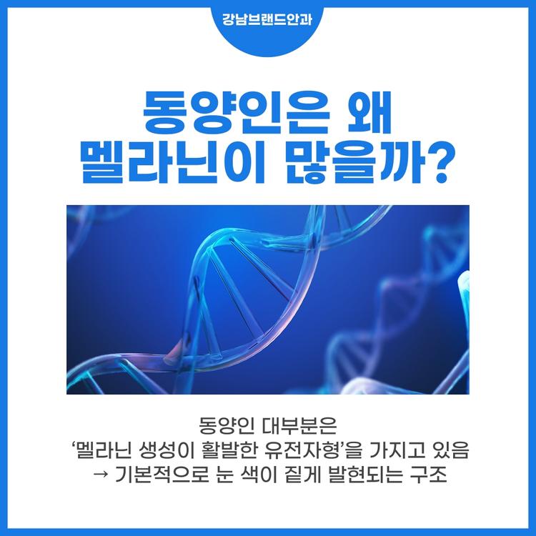 서양인의 눈 색이 파란 계열로 발달한 것은 멜라닌 생성이 감소한 돌연변이가 북유럽 쪽에서 확산되었기 때문입니다. 하지만 동양에서는 이러한 돌연변이가 크게 퍼질 이유가 없었고, 자외선이 강한 지역 환경 속에서는 짙은 색이 더욱 적합하여 자연스럽게 보편적인 특징이 되었습니다.