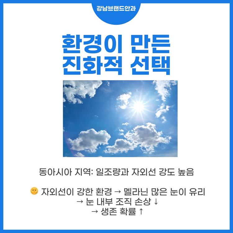 동아시아 지역은 일조량이 높고, 여름철 자외선 강도가 큰 편입니다. 이러한 환경에서는 멜라닌이 많은 눈 색이 훨씬 유리합니다. 멜라닌은 자외선으로부터 눈 내부를 보호해주기 때문에, 수천 년 동안 어두운 눈동자를 가진 사람이 더 생존에 유리했고 그 유전이 이어진 것입니다.