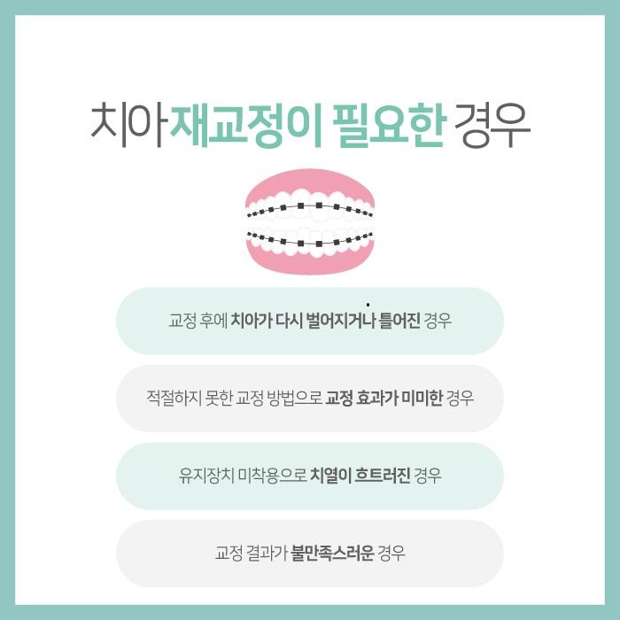 치아 재교정이 필요한 경우 01 교정 후에 치아가 다시 벌어지거나 틀어진 경우 02 적절하지 못한 교정 방법으로 교정 효과가 미미한 경우 03 유지장치 미착용으로 치열이 흐트러진 경우 04 교정 결과가 불만족스러운 경우