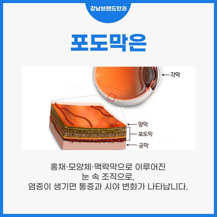 눈 안에는 홍채, 모양체, 맥락막으로 이루어진 ‘포도막’이라는 구조가 있다. 이 포도막은 눈에 영양을 공급하고 빛 조절에 관여하는 중요한 역할을 한다. 포도막염은 이 구조 중 일부 또는 전체에 염증이 생긴 상태를 의미한다.