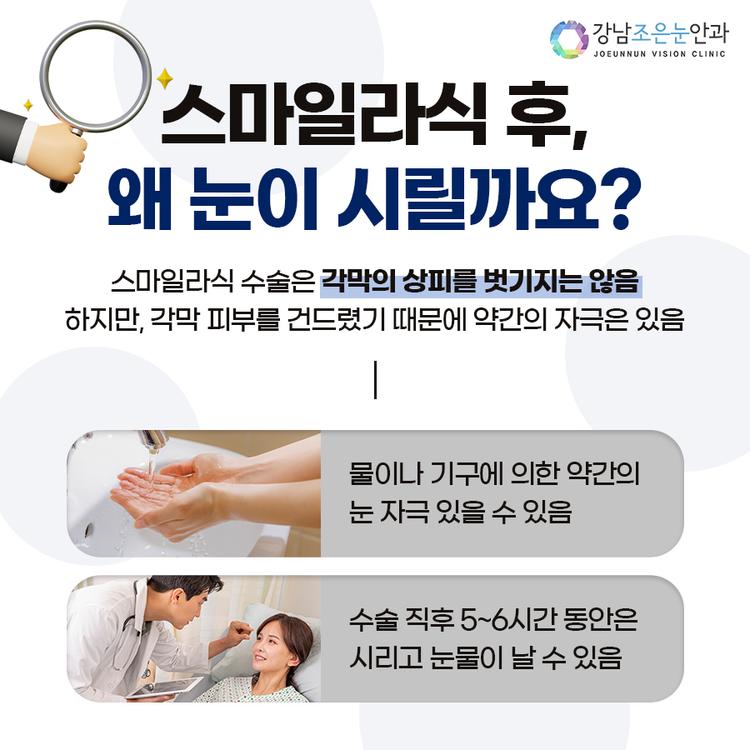 안녕하세요, 강남조은눈안과입니다! 스마일라식 후에 느껴지는 여러가지 느낌들이 있는데요. 그 중 눈이 유독 시리게 느껴질 수 있어요. 스마일라식 후에는 왜 눈이 시린걸까요? 오늘은 스마일라식 후에 눈이 시린 이유에 대해서 알아보도록 합시다!