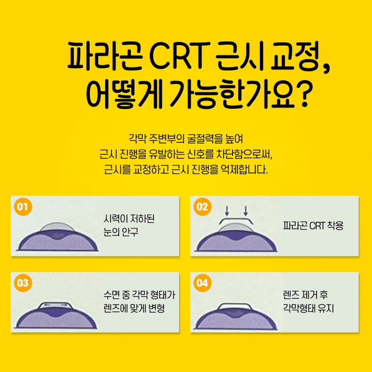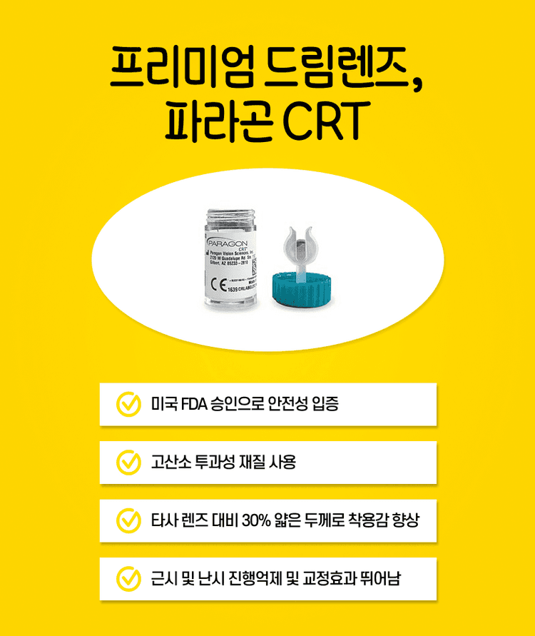 현재 국내외에서 사용되고 있는 드림렌즈는 제조사와 설계 방식에 따라 다양한 종류가 있으며, 대표적으로 다음과 같은 제품들이 있습니다. 1️⃣파라곤 CRT 파라곤 CRT 렌즈는 2002년 세계 최초로 미국 FDA 승인을 받은 드림렌즈로, 현재 국내에서도 가장 널리 사용되고 있는 제품입니다. 서초안과 성모원에서도 해당 렌즈를 사용하고 있는데요. 파라곤 CRT 렌즈의 큰 특징 중 하나는 중심 두께가 0.16mm로 '매우 얇다'는 점입니다. 기존 드림렌즈보다 약 30% 얇게 설계되어 착용감이 우수할 뿐만 아니라, 수면 중 렌즈가 각막 중심에 안정적으로 위치할 수 있도록 도와줍니다. 다음 날 렌즈를 제거한 후에도 보다 선명하고 안정된 시력을 유지하는 데 중요한 요소로 작용하고 있어요. 또한 렌즈가 얇을수록 '산소 투과율'이 높아지기 때문에 파라곤 CRT 렌즈는 눈 건강 측면에서도 유리한 제품으로 평가 받고 있는데요. 파라곤 CRT 는 –6 디옵터 이하의 근시와 –1.75 디옵터 이하의 난시를 가진 분들에게 적합하며, 진행성 근시가 심해지는 성장기 학생·근시 교정이 필요한 성인 근시 환자·이전에 라식과 같은 시력교정술을 받았으나 시력이 불완전한 분들에게 좋은 선택지가 될 수 있습니다. 2️⃣LK 렌즈 LK 렌즈를 개발한 ‘루시드 코리아’는 국내 기업으로, 수년간 한국인의 각막에 대한 임상과 연구를 통해 한국인의 눈 구조에 보다 적합한 드림렌즈를 개발해왔다는 평가를 받고 있는데요. 파라곤 CRT 렌즈에 비해 렌즈 중심부의 두께는 다소 두껍지만, 그만큼 각막을 눌러주는 힘이 더 크게 작용하여 교정 효과에 있어 유리한 측면이 있습니다. 또한 기존의 4커브 설계에서 5커브 설계로 개선되면서, 렌즈와 각막 사이의 밀착 면적을 줄여 보다 정밀한 시력 교정이 가능해졌죠. LK 렌즈는 –5 디옵터 이하의 중등도 근시와 –2 디옵터 이하의 난시를 가진 경우에 특히 좋은 효과를 기대할 수 있으며, '한국인 눈에 맞춘' 설계라는 점에서 높은 만족도를 얻고 있어요.