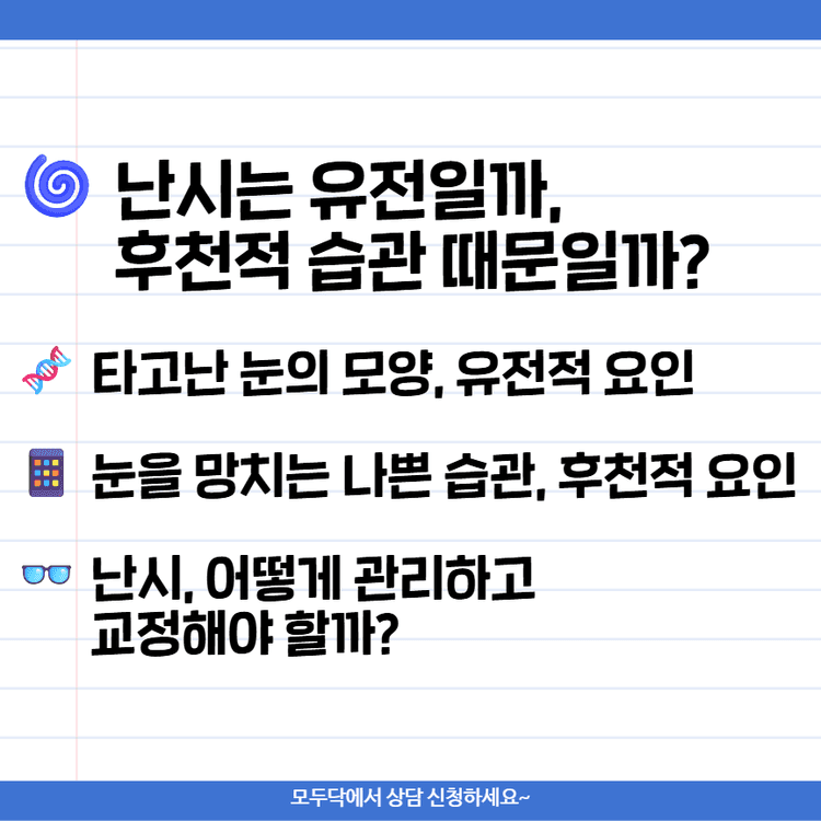 결론적으로 난시는 타고난 체질적인 부분이 크지만, 이를 관리하고 악화되지 않게 만드는 것은 개인의 습관에 달려 있습니다. 부모님께 물려받은 눈의 구조를 바꿀 수는 없지만, 눈을 비비지 않고 바른 자세를 유지하는 것만으로도 난시가 심해지는 것을 상당 부분 막을 수 있습니다. 지금 사물이 번져 보이거나 눈의 피로가 극심하다면, 그것이 유전이든 습관이든 상관없이 정확한 검사를 받는 것이 최우선입니다. 여러분의 소중한 눈, 올바른 이해와 관리로 더 선명하게 지켜내시길 바랍니다.