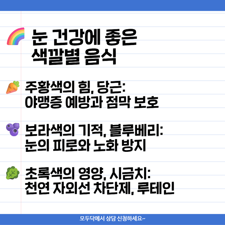 스마트폰과 모니터에 온종일 노출된 현대인의 눈은 매일 극심한 피로를 느낍니다. 시력이 한번 나빠지면 자연적으로 회복하기가 매우 어렵기 때문에, 평소 식습관을 통해 눈에 필요한 영양소를 충분히 공급해 주는 것이 무엇보다 중요한데요. 우리 주변에서 쉽게 구할 수 있는 알록달록한 '컬러 푸드' 속에 눈 건강을 지키는 핵심 열쇠가 들어있습니다. 오늘은 눈을 위해 꼭 챙겨 먹어야 할 당근, 블루베리, 시금치의 효능과 올바른 섭취법을 알아보겠습니다.